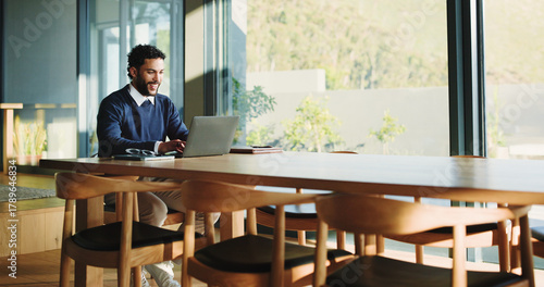 Laptop, smile and typing with business man in office for legal report, witness testimonial and reading. Court case planning, attorney records and tech with male person in law firm for schedule