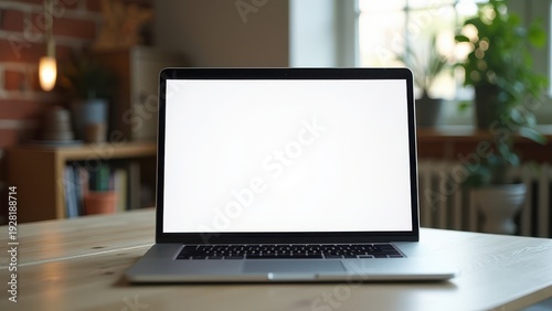 laptop with blank screen on table indoor workspace scene concept of technology business, digital marketing, freelance work