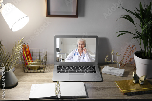 Laptop with female doctor on screen in room. Concept of telemedicine