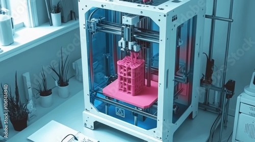 large 3D printer producing complex design in modern workspace, showcasing advanced technology and creativity. vibrant pink material contrasts with sleek white machine