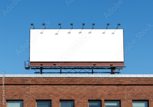 Large blank billboard atop a brick building against a clear blue sky on a sunny day for advertising use