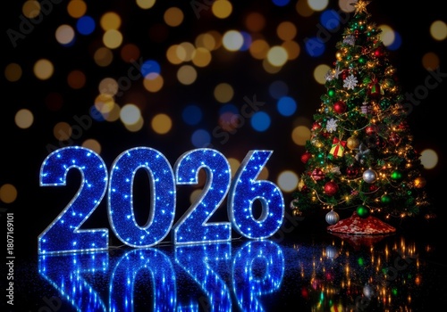 Large blue illuminated 2026 numbers standing next to a decorated Christmas tree, colorful bokeh colors, New Year party night concept.