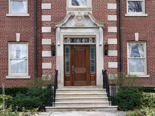 Large brick house with elegant wooden door surrounded by elaborate stone frame