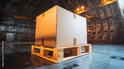 Large cardboard box on wooden pallet inside cargo aircraft.
