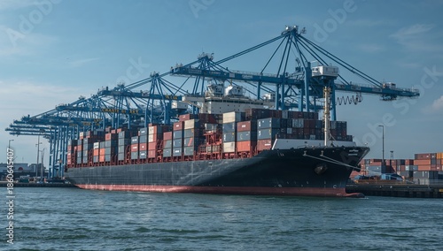 Large Cargo Ship at Port With Cranes Lifting Containers in Broad Daylight on a Clear Day