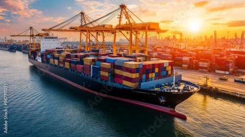 Large cargo ship loaded with containers docked at a busy port during sunset, highlighting global trade and logistics operations.