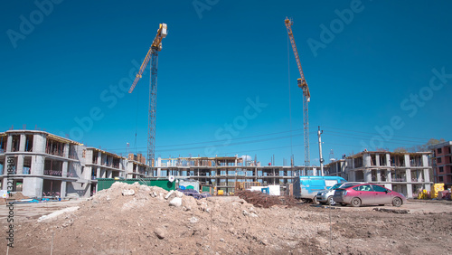 Large construction site with buildings under construction and multi-storey residential homes timelapse hyperlapse.