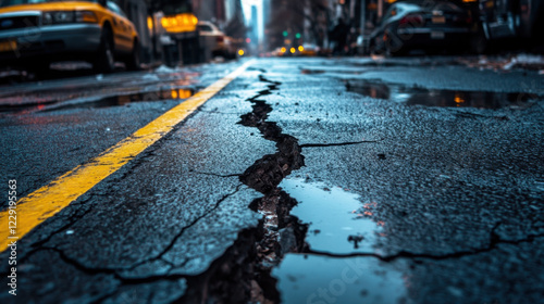 large crack runs down wet street in NYC, reflecting city lights and creating dramatic urban scene. cracked asphalt highlights wear and tear of road