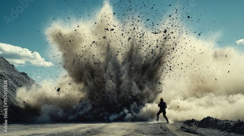 Large explosion creates a massive dust cloud in a rocky landscape during daytime