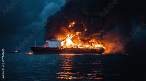 Large general cargo ship for logistic import export goods and other the explosion and had a lot of fire and smoke at sea in evening -