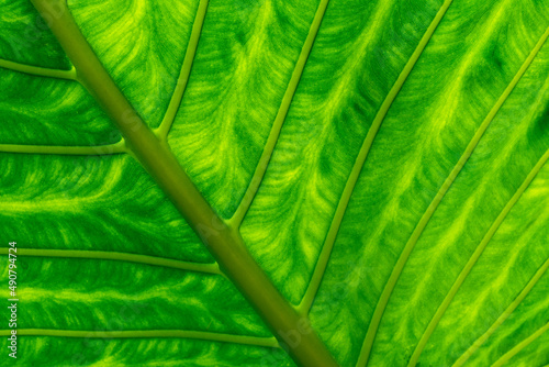 Large Green Leaf with Vains Macro in the Sunlight passing through