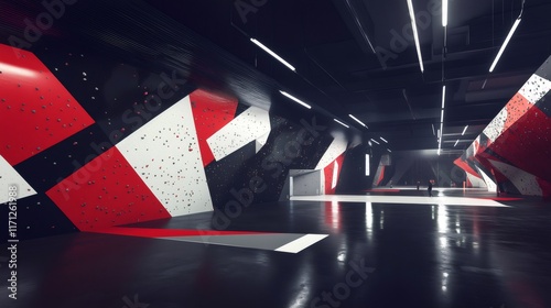 Large indoor climbing gym with colorful walls and shiny floor