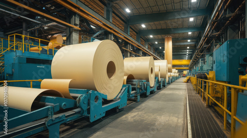 Large industrial paper mill featuring rolls of unfinished paper on conveyor belts. The setting is bright with machinery and stacks of paper visible.