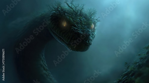 Large, leafy creature with glowing yellow eyes in foggy swamp environment