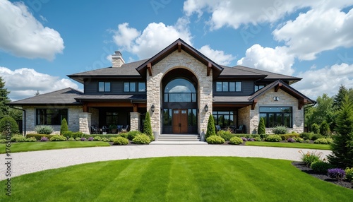Large luxury house with stone facade, dark roof. House brown wooden door, large windows, stone archway. Property features well-manicured green lawn, gravel driveway, various plants, flowers. Blue sky