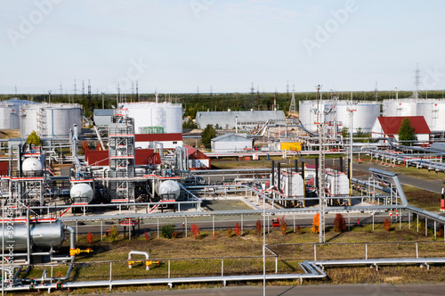Large Oil Industrial Facility, equipment, pipelines, tanks with oil products, utilities.