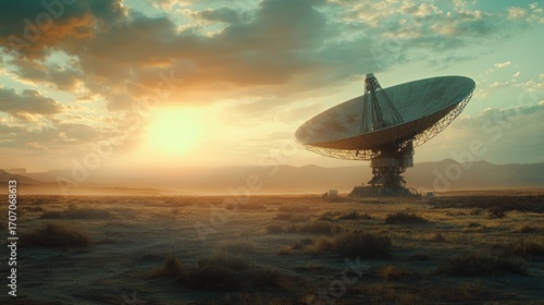 Large Satellite Dish in a Desert Landscape at Sunset