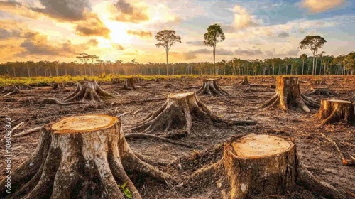 Large sections of a devastated rainforest with trees cut down and exposed stumps, illustrating deforestation's impact on the ecosystem