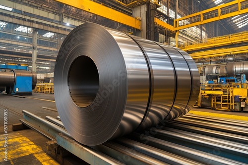 Large steel rolls in industrial factory, symbolizing strength, manufacturing, heavy industry, precision engineering, and modern production efficiency