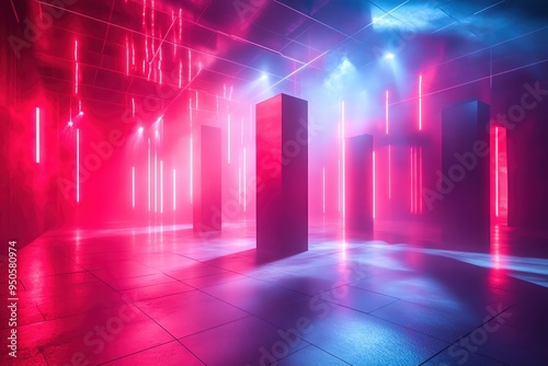 Laser grid lights forming a 3D cube, intense red and blue colors, hightech futuristic stage design ,