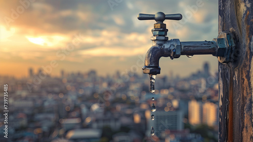Last drops of water from an aged faucet against a backdrop of a dry city, urban water shortage concept.