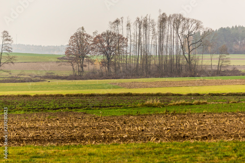 Late autumn. Mown field and green meadows. Trees without leaves and forest in the fog in the background. Site about agriculture. Podlaskie, Poland.