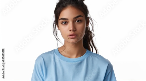 Latin american latina woman wearing plain pure light blue blank oversized crew neck loose t-shirt isolated on white background