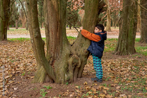 Latin boy with his eyes closed hugging a tree in a forest on an autumn afternoon. Concept of loving and saving the nature.