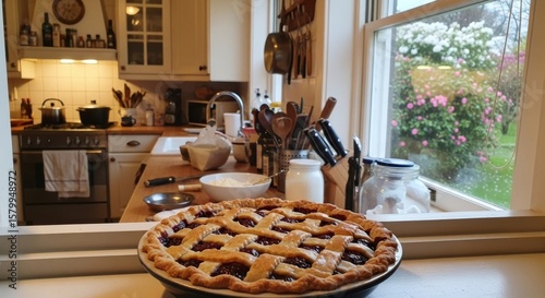 Lattice-Topped Berry Pie on Kitchen Window Sill with Garden View