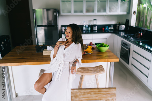 Laughing lady leaning on counter in modern apartment