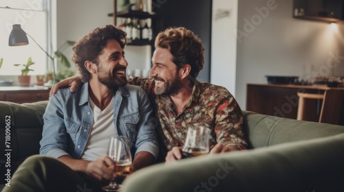 Laughing, relaxing gay couple chatting on the couch with a glass of wine.