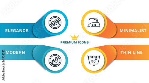 laundry instructions outline icons with infographic template. thin line icons such as no shouting allowed, no bomb jump, hot iron, null vector.