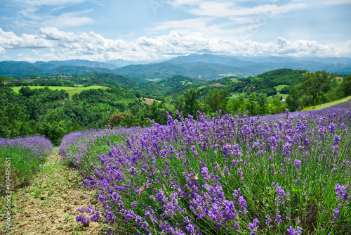 Lavender field in bloom near the village of Sale San Giovanni, Langhe region, Piedmont, Italy