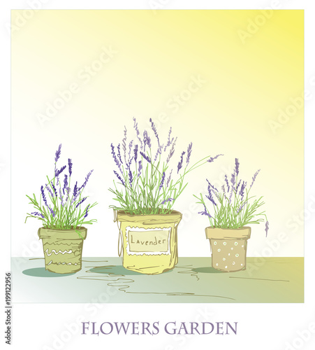 Lavender in pots. Garden flowers in the style of Provence. Medicinal flowers. Mountain flowers are lilac.