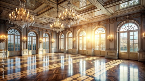 Lavish ballroom with chandeliers and sunlight streaming through large windows, ballroom, chandeliers, sunlight, large windows