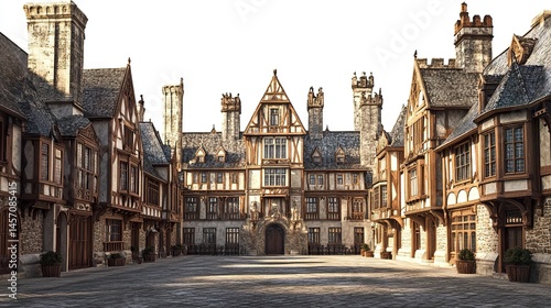 Lavish boarding school with towering spires intricate woodwork and cobblestone pathways studio lighting centered composition minimal white background.