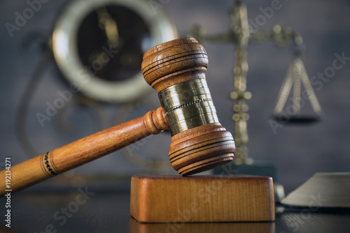 Law and Justice concept. Brown wooden background