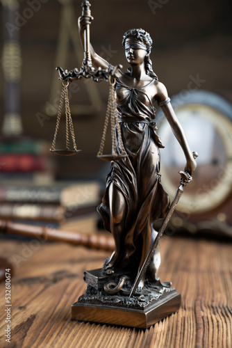 Law theme - judge office. Themis sculpture and legal books on the judge desk.