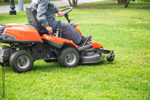 Lawn mower. Mowing the lawn by a utility worker.