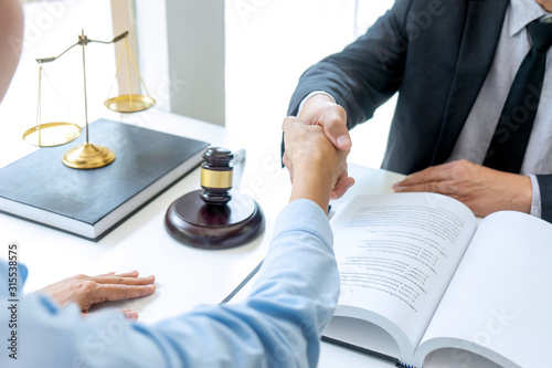 Lawyer or judge with gavel and balance handshake