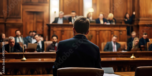 Lawyer presenting a case to the jury, with the judge and courtroom audience attentively listening.