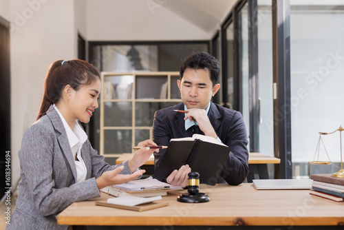 Lawyer with Document Paper and Hammer on Wood table, Judge's Gavel, Law, Justice Symbol, Agreement and Partnership Concept,