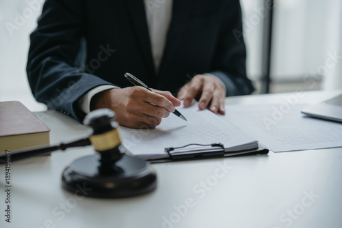 Lawyer working with lawsuit in courtroom, Criminal and judgement concept