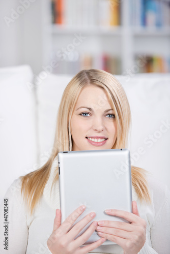 lächelnde junge frau liest am tablet-pc