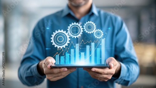 Leadership enhances employee engagement and active involvement concept. Person holding a tablet displaying graphs and gears in a business setting.
