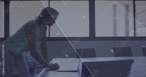 Leaning woman focusing on laptop in conference room, with long table and windows copy space