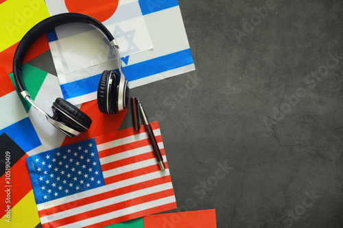 Learning foreign languages. Audio language courses. Background from countries flags and headphones on the table.
