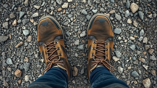 Leather boots stand on rocky ground
