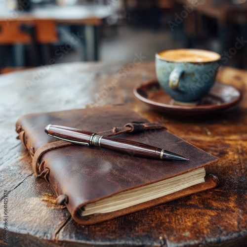 Leather journal, pen, coffee, cafe, outdoor setting; writing, planning, relaxation