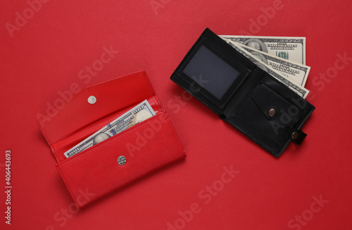 Leather wallets with one hundred dollar bills on red background. Top view